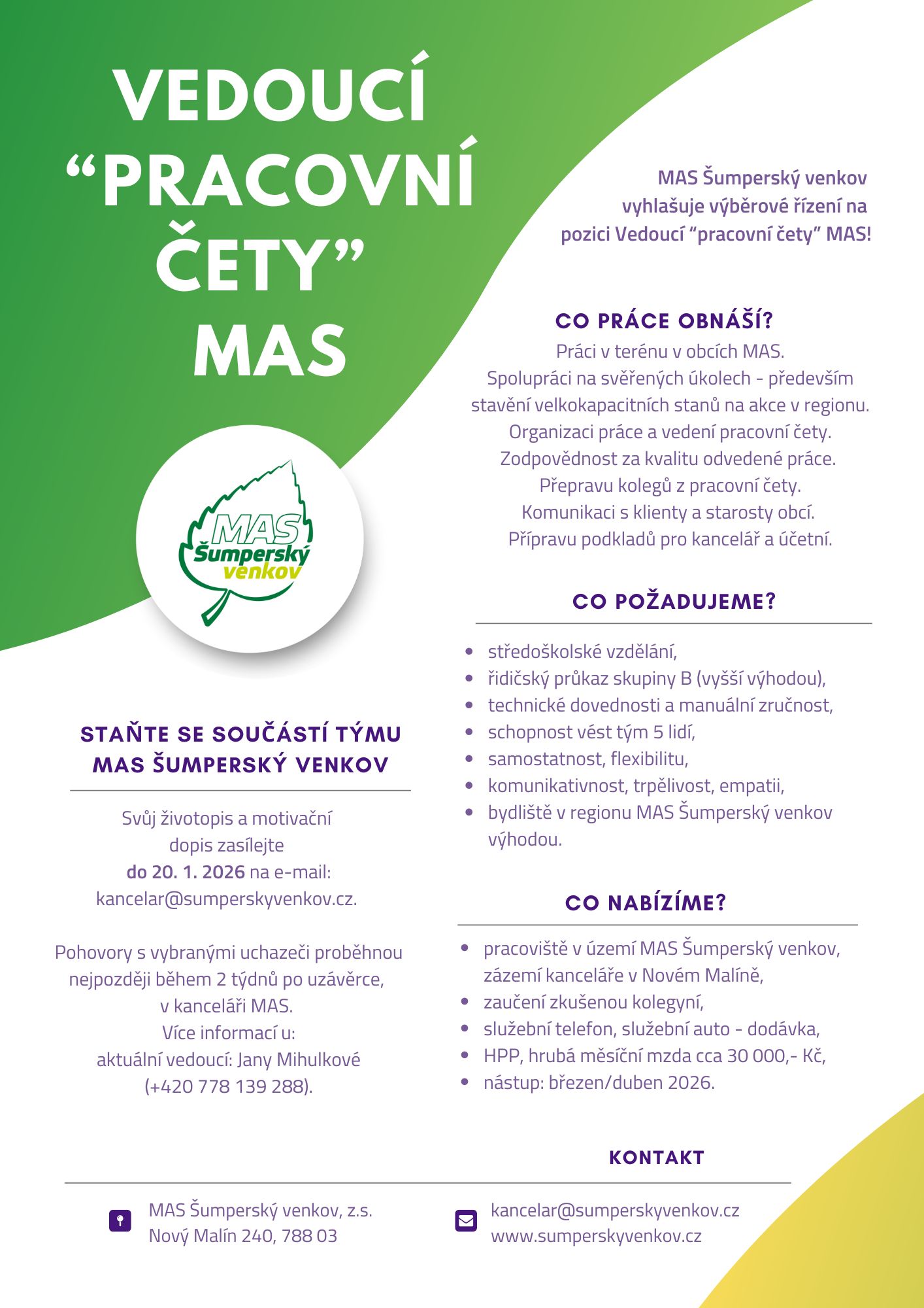 MAS Šumperský venkov vyhlašuje výběrové řízení na pozici Vedoucí „pracovní čety“ MAS.