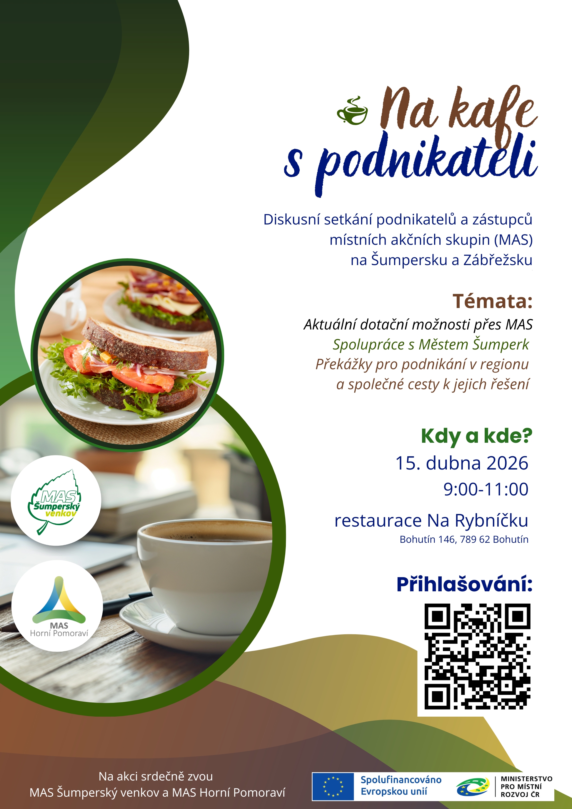 Po úspěšném prvním setkání ve Velkých Losinách pokračujeme v sérii diskusních setkání „Na kafe s podnikateli“. Další setkání proběhne 15. dubna 2026 v Bohutíně ve spolupráci MAS Šumperský venkov a MAS Horní Pomoraví. Zveme podnikatele ze Šumperska a Zábřežska k neformální diskusi, sdílení zkušeností i navázání nových kontaktů.