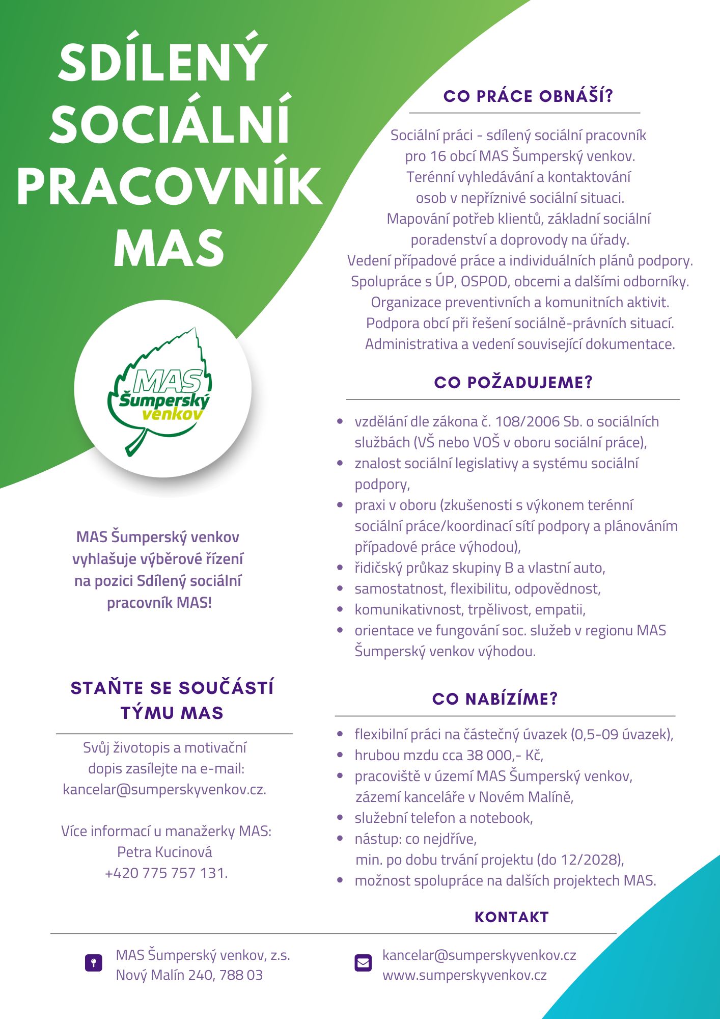 MAS Šumperský venkov vyhlašuje výběrové řízení na pozici Sdílený sociální pracovník pro území 16 obcí naší MAS. Jedná se o smysluplnou práci v terénu i kanceláři s přímým kontaktem s lidmi, obcemi i odborníky v oblasti sociální podpory.