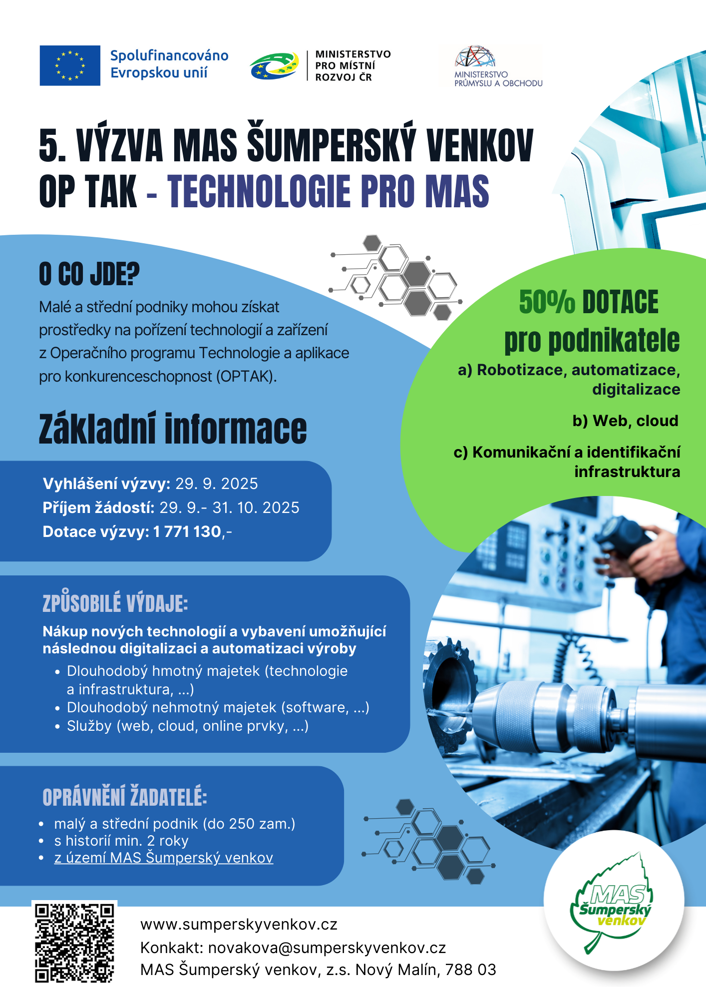 29. 9. 2025 budeme vyhlašovat 5. výzvu z nového programu OP TAK zaměřenou pro malé a střední podniky na nákup nových technologií. Bližší informace k výzvě, pravidla, manuály a vzory naleznete níže. Nadřazená výzva Technologie pro MAS (CLLD) - výzva I. končí 31.12.2025 - do tohoto data musí být žádost podána v ISKP21+.
